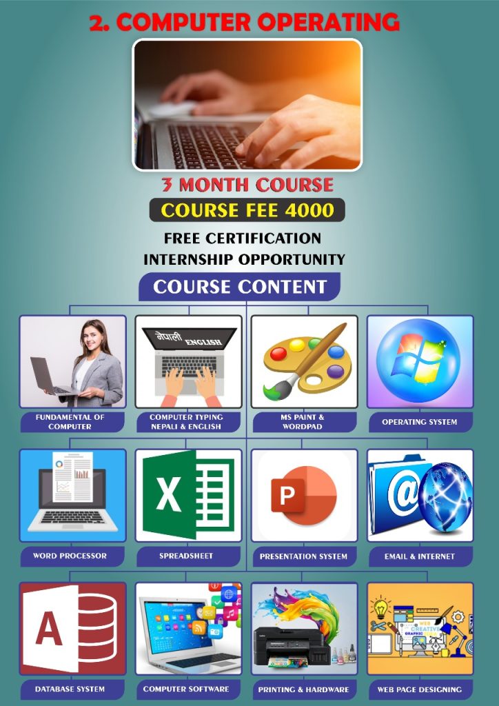 The Computer Operating Course is a 3-month professional training program designed to provide in-depth knowledge of computer operations, software, and essential digital skills. This course is ISO and CTEVT certified, ensuring that students receive high-quality education with recognized certification upon completion.
